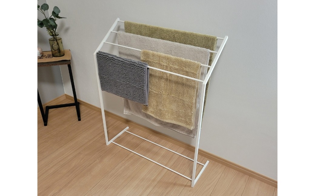 ・奥行25cmの省スペース設計で場所を取らなず、大判サイズのバスタオルが4枚ゆったり掛けられるモダンでスタイリッシュなデザインのバスタオルスタンドです。バスマットやフェイスタオルと併用して使うとより便利です。