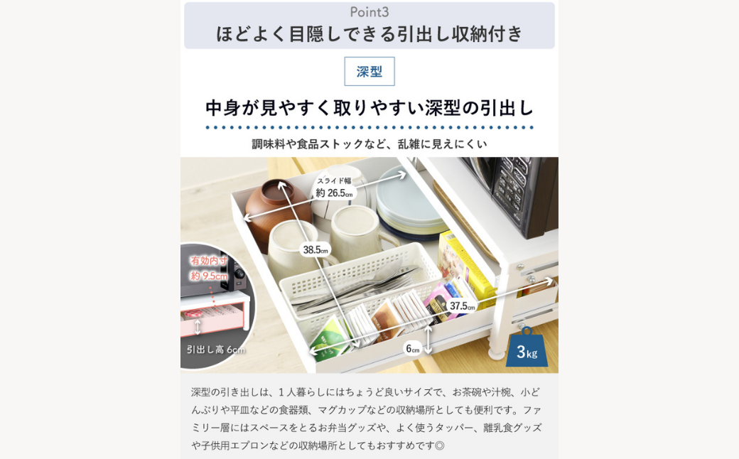 ■台座にはレンジ、その上にはトースター、引き出しには食器類やマグカップの収納、箸やスプーン、関連する小物をひとまとめ整理収納。また上棚ストック食品の収納場所として活用でき、この1台があればスッキリお使いいただけます。