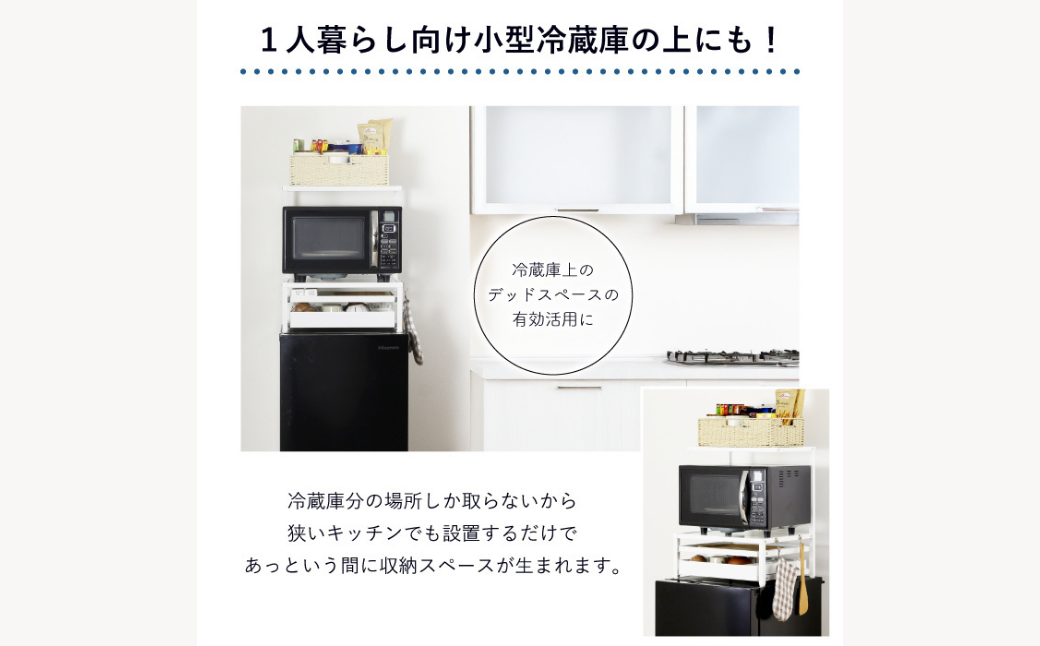 ■一人暮らし向け小型冷蔵庫上に置く置くことができ、冷蔵庫上のデッドスペース活用し、手狭なキッチンスペース有効活用できます。