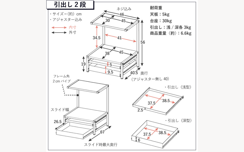 | 容量 | ●サイズ:約 幅46×奥行40.5×高さ56cm ●内寸:天板/約 幅45×奥行30cm 台座/約 幅45×奥行38×高さ34.5cm 引出し/浅型:約 幅38.5×奥行37.5×深さ2.5cm、 深型:約 幅38.5×奥行37.5×深さ6cm ●重量:6.6kg ●カラー:ホワイト ●材質:スチール/粉体塗装 ●耐荷重:天板/5kg、台座/30kg、引出し/(浅型))3kg、(深型)3kg ●その他:組立品 |