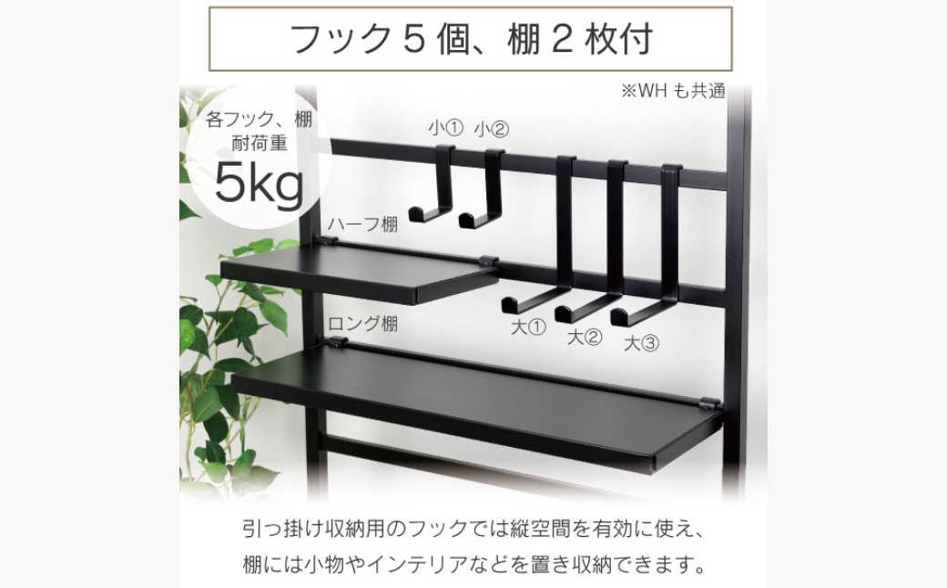 | 容量 | ●サイズ:約 幅57.8×奥行20×高さ200~285cm ●重量:9.1kg ●カラー:ホワイト ●材質:スチール(メラミン焼付塗装) ●耐荷重:全体40kg(ラダーパイプ1本あたり10kg、棚1枚あたり5kg、フック1個あたり5kg) ●付属品:フック(大)×3個 、フック(小)×2個、棚(大)×1枚、棚(小)×1枚 ●その他:お客様組立品(目安2人で20分程度) |