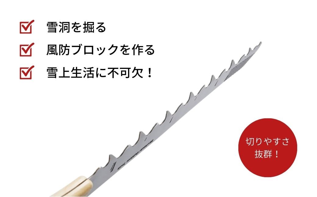 雪洞を掘ったり、テントの周りに風防ブロックを積んだり、雪上生活で欠かせないスノーソー。
