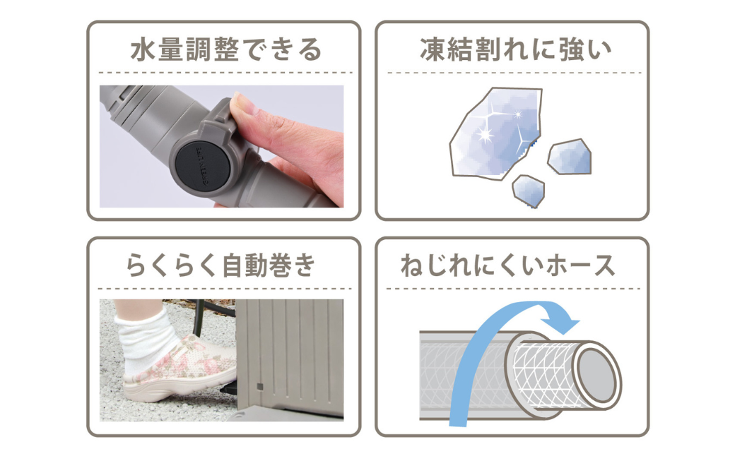 耐寒・耐圧ホースを使用しています。 水流は用途に合わせて変えられる8通り(シャワー・フル・霧・ストレート・整流・広拡散・拡散・止水)。 ノズルホルダー付きなので、使わないときにはすっきりノズルを収納できます。