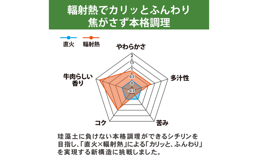 中心部は直火でカリッと、外側は輻射熱でじっくりと、焦がさずふっくら焼けます!