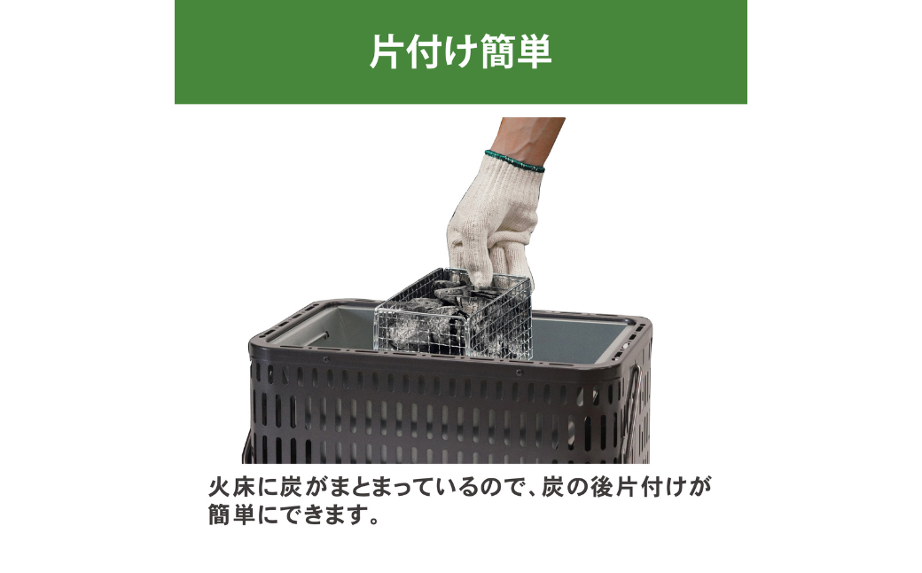 ◎火床に炭がまとまっているため、炭の後片付けが簡単です。