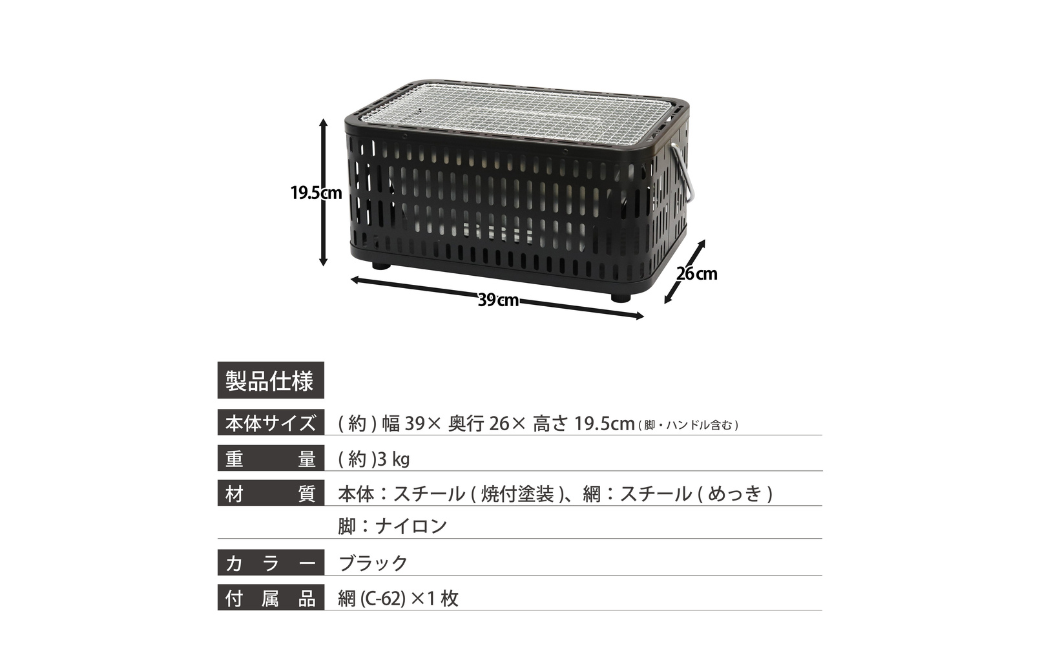 | 容量 | ●サイズ:約26.5×40.5×19.6cm(取っ手・脚含む) ●重量:約3kg ●材質:本体/スチール(焼付塗装)、網/スチール(めっき) ●カラー:マットブラック ●付属品:網×1枚 |