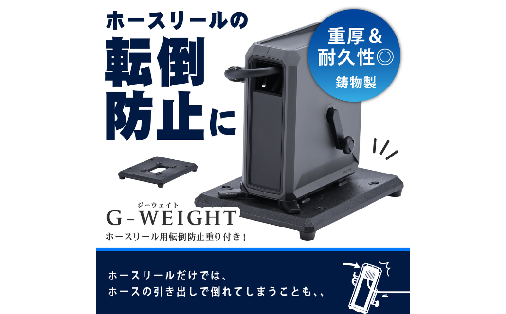 ●台座をホースリールに取り付けることで、重りの役割を果たし、ホースの引き出し時・散水中にホースリールが転倒するのを防止します。