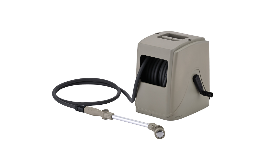 ロングノズルで株元に差し込みやすい、園芸に特化したカバー付きホースリール