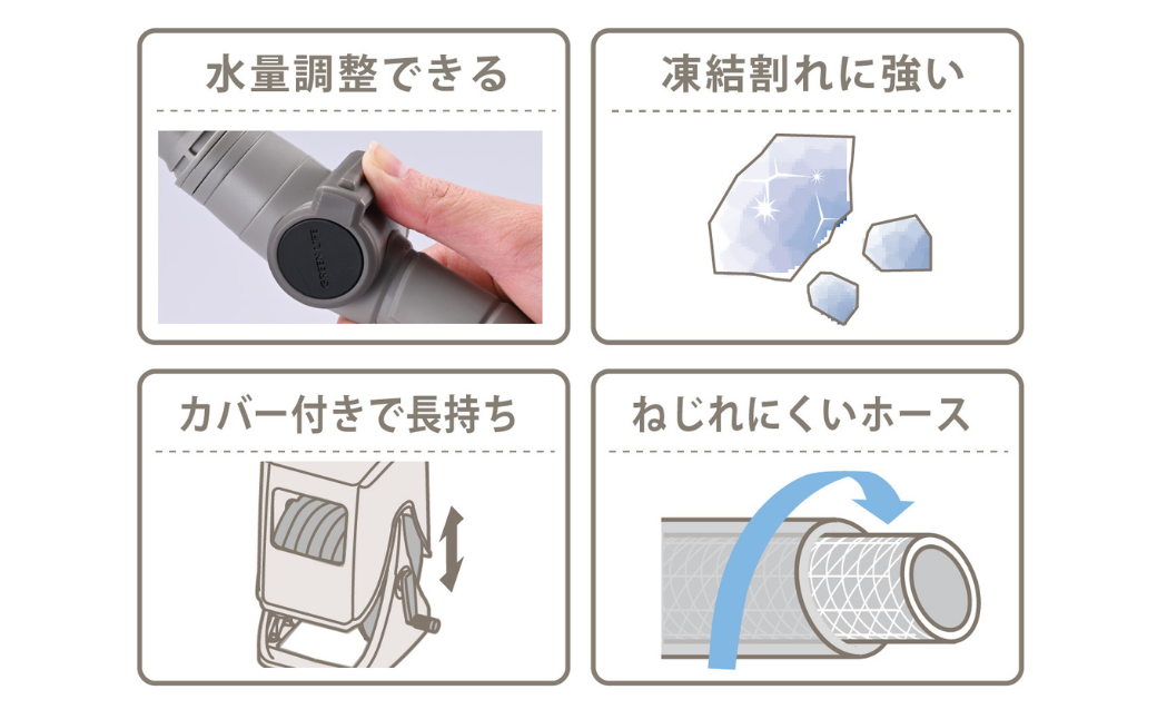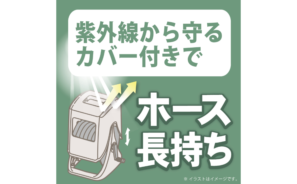 本体はカバー付きで、ホースを直射日光から守り劣化を防ぎます。