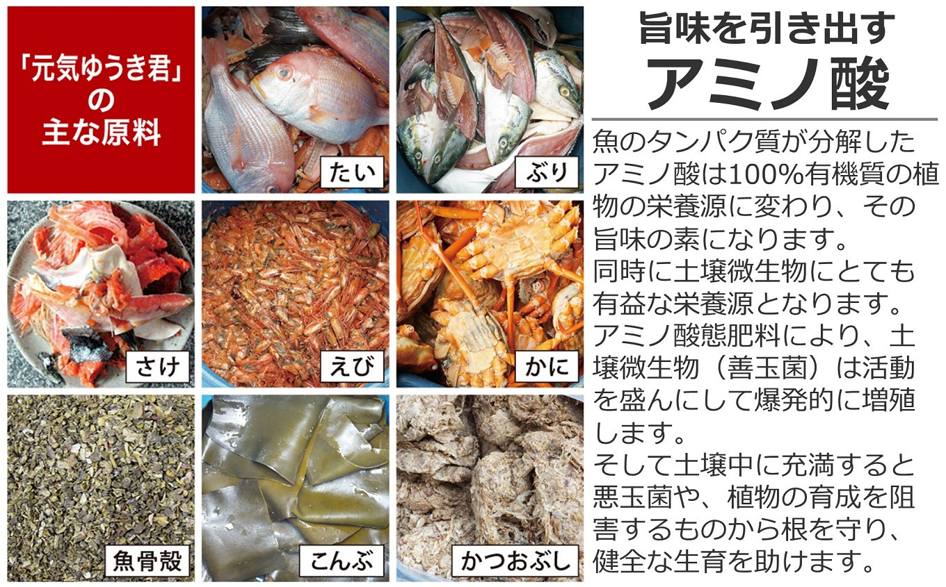 魚のタンパク質が分解したアミノ酸は100%有機質の植物の栄養源に変わり、その旨味の素になります。