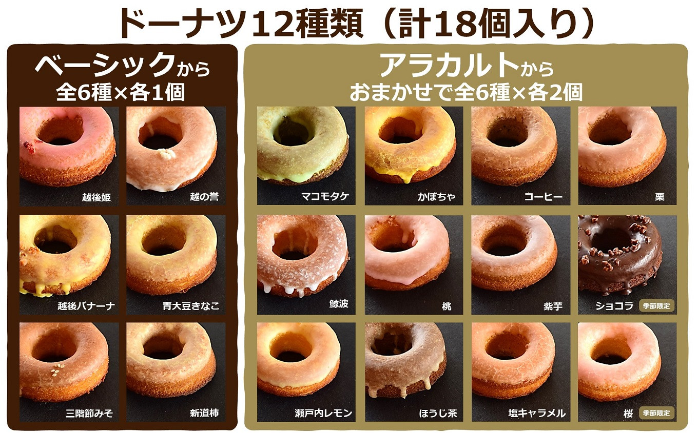 | 容量 | ・季節のおまかせドーナツ:18個 <ベーシック:6種を各1個ずつ> ・越後姫ドーナツ ・越後バナーナドーナツ ・三階節みそドーナツ ・越の誉ドーナツ ・新道柿ドーナツ ・青大豆きな粉ドーナツ <アラカルト:12種の中から、おまかせで6種を各2個ずつ> ・鯨波ドーナツ ・ほうじ茶ドーナツ ・桃ドーナツ ・コーヒードーナツ ・マコモタケドーナツ ・塩キャラメルドーナツ ・紫芋ドーナツ ・瀬戸内レモンドーナツ ・栗ドーナツ ・かぼちゃドーナツ ・ショコラドーナツ(11月~3月限定) ・桜ドーナツ(11月~3月限定) |