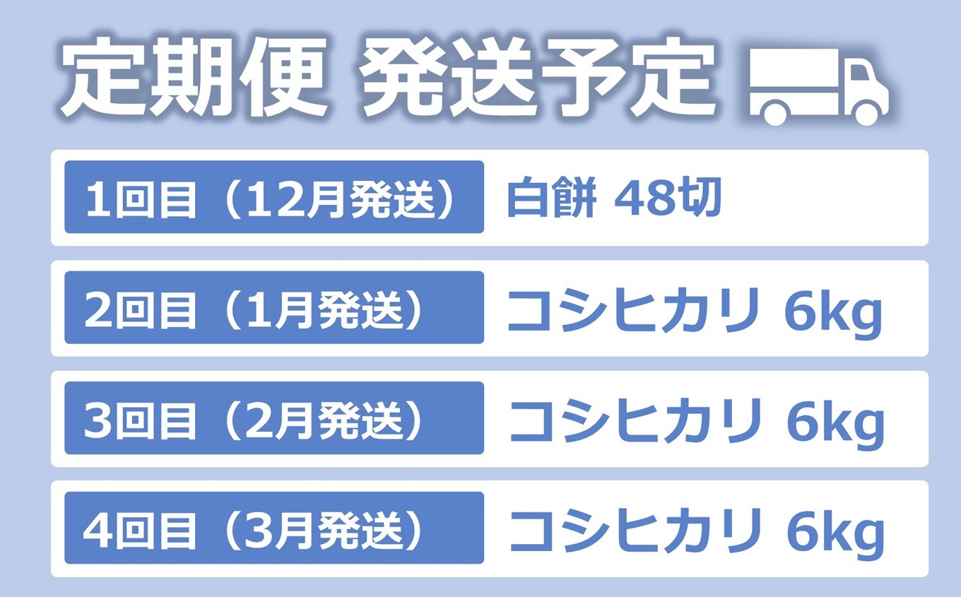 | 容量 | 杵つき白餅(2.4kg×1回発送)とコシヒカリ 無洗米(6kg×3回発送)の定期便 【1回目・12月発送】白餅:400g(8切)×6パック(計 48切) 【2回目・1月発送】新潟県認証 特別栽培コシヒカリ 無洗米(真空パック):6kg(3kg×2袋) 【3回目・2月発送】新潟県認証 特別栽培コシヒカリ 無洗米(真空パック):6kg(3kg×2袋) 【4回目・3月発送】新潟県認証 特別栽培コシヒカリ 無洗米(真空パック):6kg(3kg×2袋) |