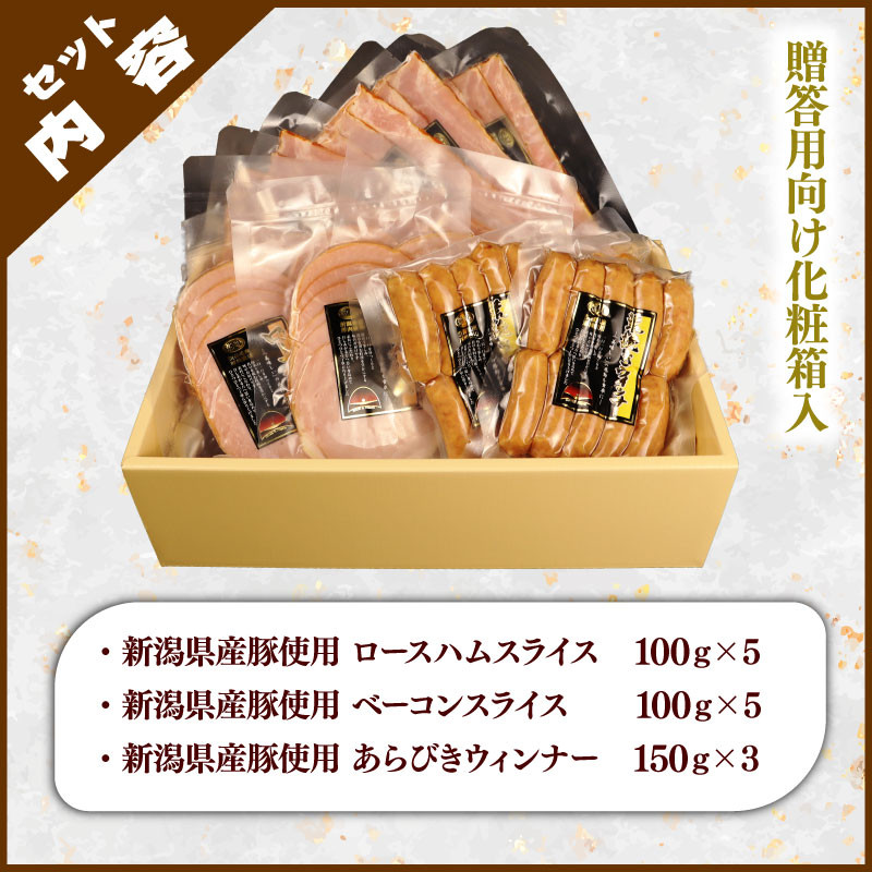 新潟県産豚肉を使用したハム・ベーコン・ウインナーの詰め合わせセットです。