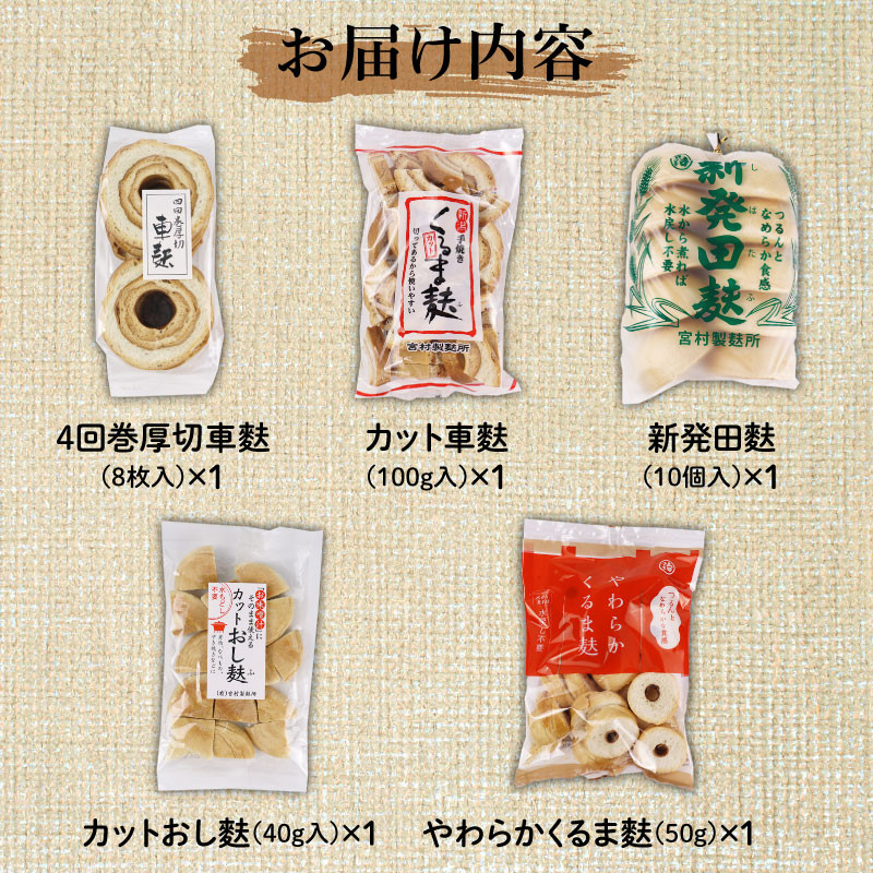 | 容量 | 4回巻厚切車麩(8枚入)×1 カット車麩(100g入)×1 新発田麩(10個入)×1 カットおし麩(40g入)×1 やわらかくるま麩(50g)×1 |