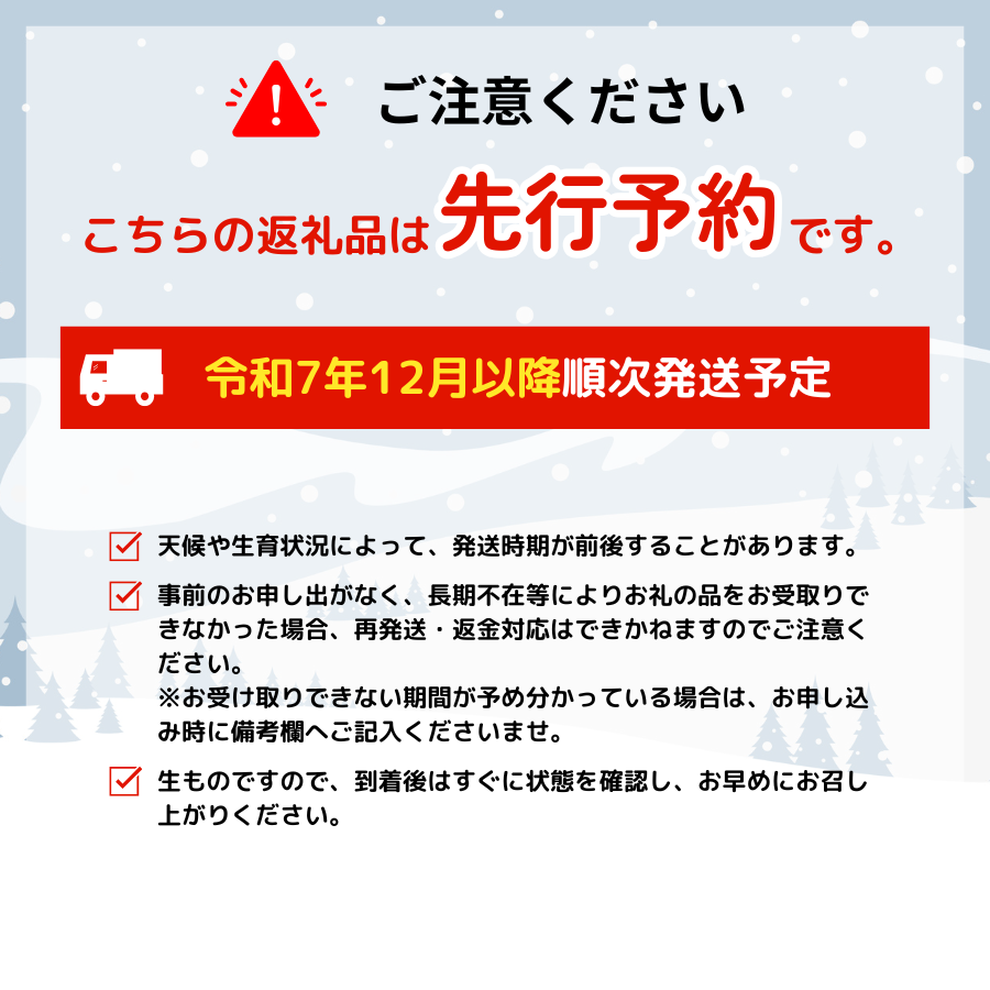 12月以降順次発送 商品が到着致しましたらすぐに開封して中身を確認していただき、できるだけ涼しいところで保管してお早めにお召し上がりください。 ※事前にお申し出がなく、長期不在等によりお礼の品をお受取りできなかった場合、再発送はできません。あらかじめご了承くださいませ。 ※出荷の際、検品後に発送しておりますが、万一商品に問題がございましたら破棄やお召し上がりになる前にご連絡ください。 ※到着予定日から、3日以上経過したものや、破棄されたものにつきましては、ご対応することが出来ませんのであらかじめご了承ください。 |