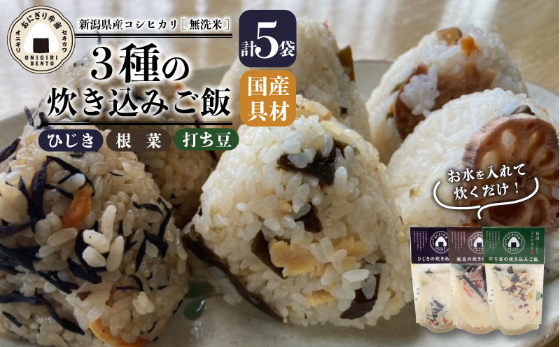 キャンプや災害備蓄食に! 無洗米 炊き込みご飯 5個 コシヒカリ 打ち豆 ひじき 根菜 オニギリ おこめ お米 米 ご飯 ごはん 人気ご飯 無添加 健康 自然 安心 おすすめ キャンプ アウトドア キャンプ飯 簡単 長期 保存 保存食 備蓄食 防災 年末 年始 ギフト プレゼント 関川産業 新潟県 新発田市 sekikawa005