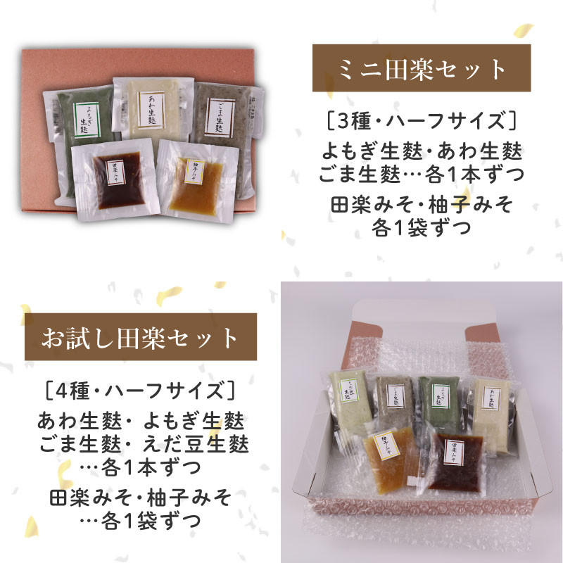 | 容量 | ミニ田楽[3種・ハーフサイズ] ・よもぎ生麩・あわ生麩・ごま生麩 各1本ずつ ・田楽みそ・柚子みそ 各1袋ずつ お試し田楽セット[4種・ハーフサイズ] ・ あわ生麩・ よもぎ生麩・ ごま生麩・ えだ豆生麩 各1本ずつ ・田楽みそ・柚子みそ 各1袋ずつ 人気No.1 |田楽セット[3種・通常サイズ]+うれしいおまけ付き〈麩まんじゅう1個〉 ・よもぎ生麩・あわ生麩・ごま生麩 各1本ずつ ・田楽みそ 3袋 大満足田楽セット[5種・通常サイズ] ・よもぎ生麩・あわ生麩・ごま生麩・えだ豆生麩・くるみ生麩 各1本ずつ ・田楽みそ・柚子みそ 各3袋ずつ ハーフサイズ:約5cm×約2cm×約10cm 約100g 通常サイズ:約5cm×約1.5cm×約18cm 約200g 田楽みそ・柚子みそ 1袋40g |