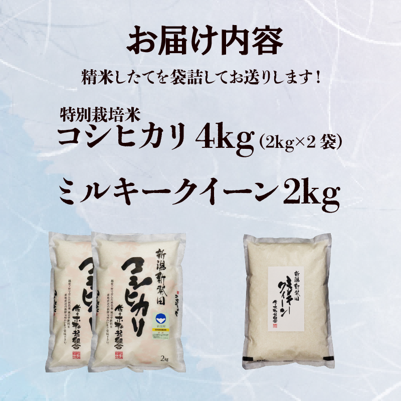 特別栽培米コシヒカリとミルキークイーンを食べ比べ! 【2026年1月発送】 お米 食べ比べ 特別栽培米 コシヒカリ 4kg ミルキークイーン 2kg 計6kg 令和7年産 新米 新潟県産 新発田市産 お米 白米 ご飯 精米 玄米 おにぎり 弁当 個包装 小分け プレゼント ギフト 贈答 のし 佐々木耕起 佐々木こうき 佐々木耕起組合 新潟県 新発田市 D07_02_202601