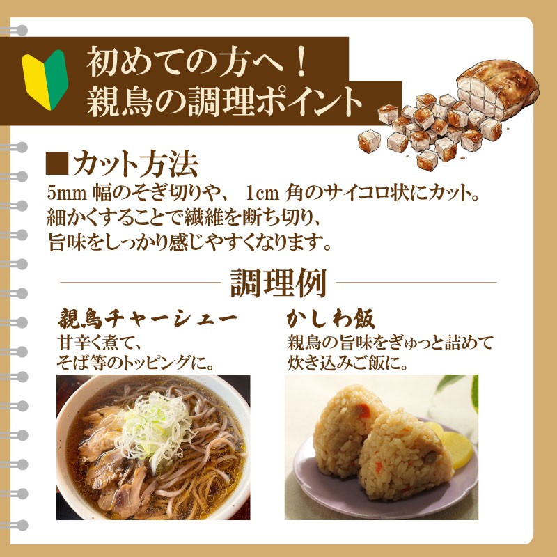 親鳥(採卵鶏)は、長い期間しっかりと育てられた成鶏で、深い旨みと力強い歯ごたえが特徴です。