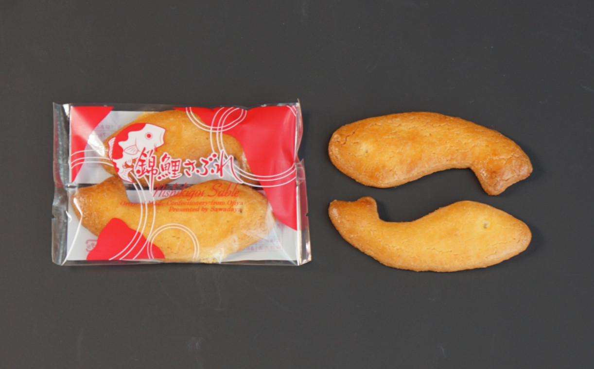 小千谷の老舗菓子店「澤田屋」より、小千谷名物「錦鯉」を型取って、純良なバターをたっぷり使って香り高いお菓子に焼き上げました。