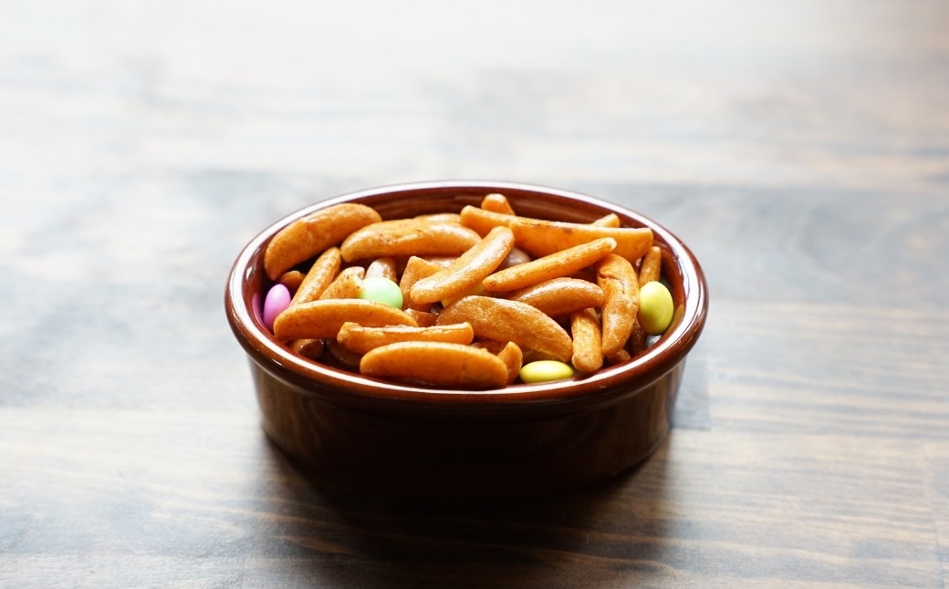 カリッと甘辛い味わいがたまらない柿の種にかわいいこんぺいとうをトッピング