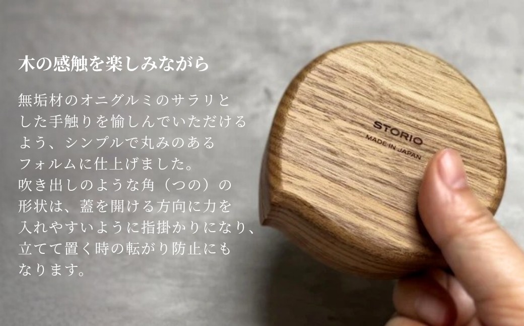 無垢材のオニグルミのサラリとした手触りを愉しんでいただけるよう、シンプルで丸みのあるフォルムに仕上げました。吹き出しのような角(つの)の形状は、蓋を開ける方向に力を入れやすいように指掛かりになり、立てて置く時の転がり防止にもなります。