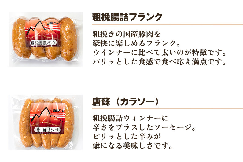 こだわりの良質な国産豚肉を使用!シンプルな味付けで肉本来の美味しさが光ります。 山長ハムギフトセット(YA-6)詰め合わせ 【4種4パック入り】《ベーコン70g、ももハム145g、粗挽フランク80g、カラソー100g》【お歳暮などの贈り物に】 国産豚使用 ハム ベーコン ブロック肉 豚肉 ソーセージ 様々なレシピに大活躍! 手作り 燻製 粗挽き 加茂 山長ハム