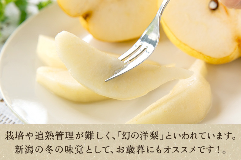 新潟県の特産品である「ル・レクチェ」は、西洋梨のなかでも栽培と追熟管理が難しく、「幻の洋梨」とも言われています。切る前から感じる濃厚な香り、とろける食感と爽やかな甘さが特徴です。