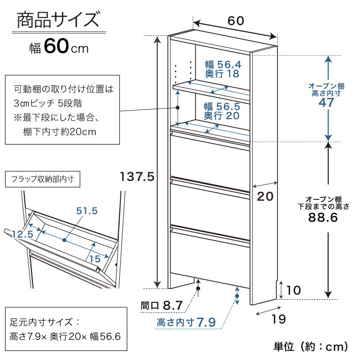 | 容量 | 【サイズ】 約幅60×奥行20×高さ137.5(cm) 【重さ】 約16.5㎏ 【耐荷重】 天板/オープン棚下段:1段あたり5kg 可動棚:2.5kg 【素材】 プリント化粧板 ポリエステル化粧合板 桐材 |