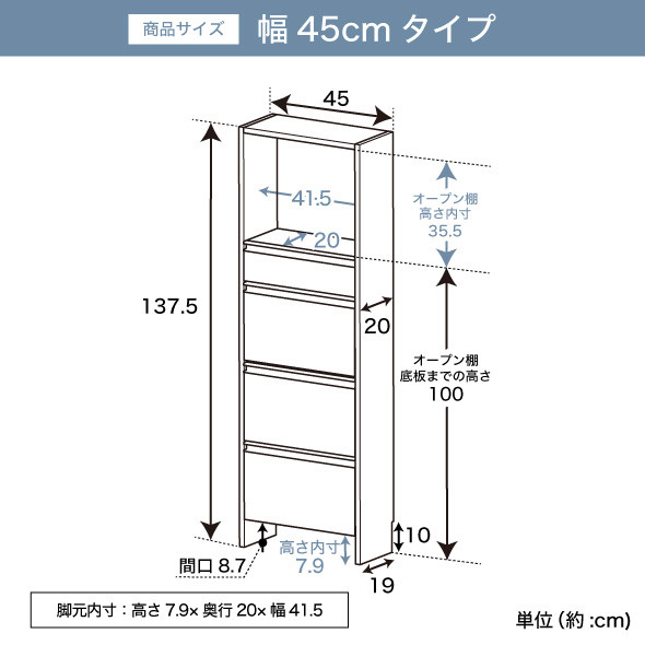 | 容量 | 【サイズ】 約 幅45×奥行20×高さ137.5(cm) 【重さ】 約15kg 【耐荷重】 天板/オープン棚下段:1段あたり5kg フラップ収納部/引き出し:1段当たり3kg 【素材】 プリント化粧板 ポリエステル化粧合板 桐材 |