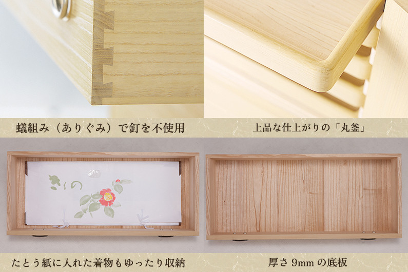 下台の引出には5~6枚のお着物がしまえ、少し深めの引き出しには、着物から普段着までの収納が可能です。