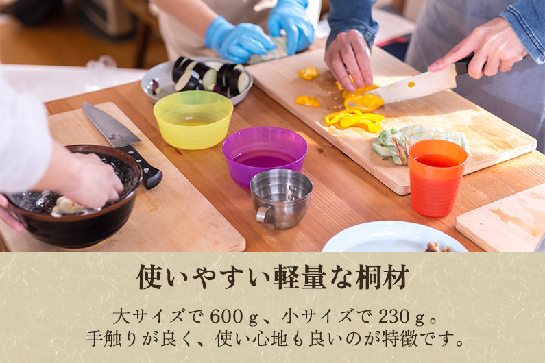 桐のまな板は他の木材に比べて非常に軽く、大サイズで600g、小サイズで230gと軽量!