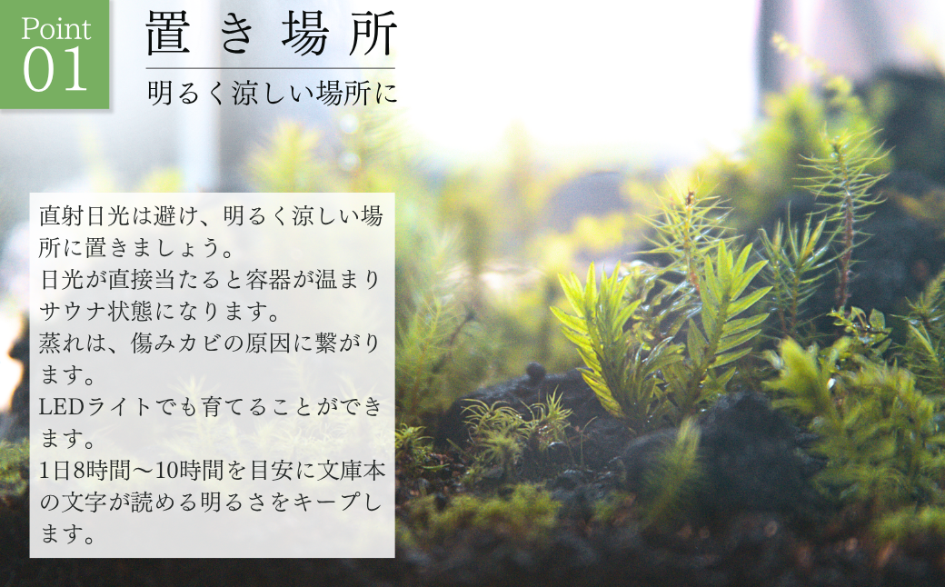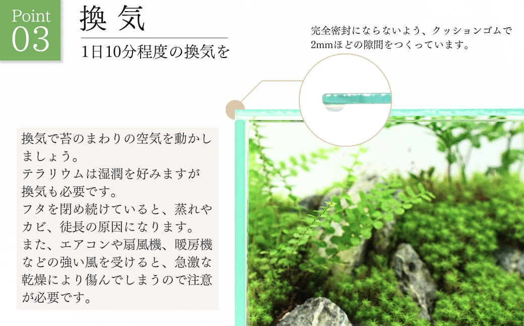 テラリウムは湿潤を好みますが、換気も必要です。フタを閉め続けていると、カビや徒長の原因となってしまいます。