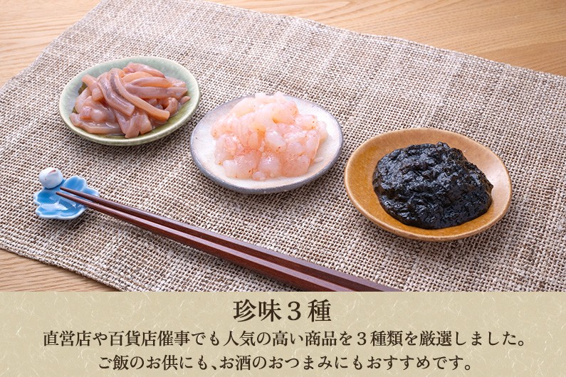 | 容量 | たらこ味噌漬:1ハラ 250g いか塩辛、のり佃煮、甘えび塩辛:各 70g |