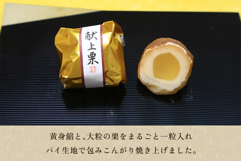 黄身餡と、大粒の栗をまるごと一粒入れ、バターの風味豊かなパイ生地で包みこんがり焼き上げました。