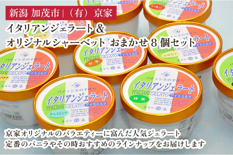 京家オリジナル!定番から季節の味までバラエティ豊かな人気ジェラート。 京家のイタリアンジェラート&オリジナルシャーベット おまかせ8個セット アイス アイスクリーム 氷菓 スイーツ ひんやり 有限会社京家 加茂市
