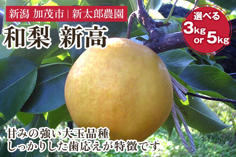 有機肥料を使用したこだわりの土で育った自慢の和梨。甘みの強い大玉品種。 【2026年先行予約】【選べる数量】和梨 新高 3kg(4〜7玉) 5kg(5〜9玉) 《10月中旬から順次発送》 果物 フルーツ 梨 和梨 デザート 加茂市 新太郎農園