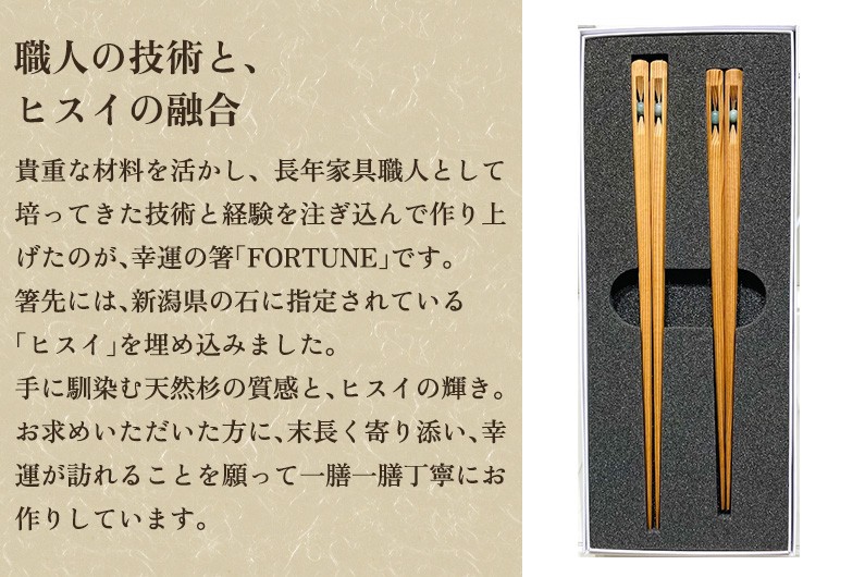 この貴重な材料を活かし家具職人として長年培ってきた技術と経験で新潟県の石に指定されている「ヒスイ」を埋め込み、幸運の箸「FORTUNE」を作りました。