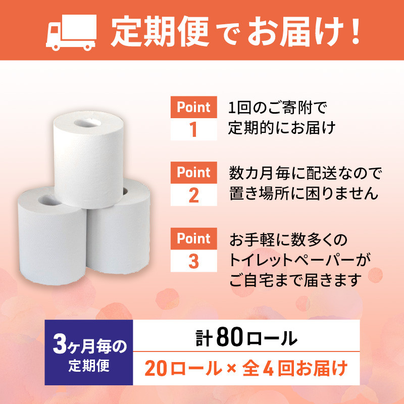 | 容量 | ・シングルTP個包装なし(長さ65m×幅114mm)20個を3ヵ月に1回、年間4回(計80個)お届けします。 ・毎回感謝の絵手紙1枚入り。 |