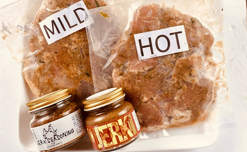 ビン詰め、冷凍ジャークチキン共に辛口と並辛の2種類が入ったセットです。