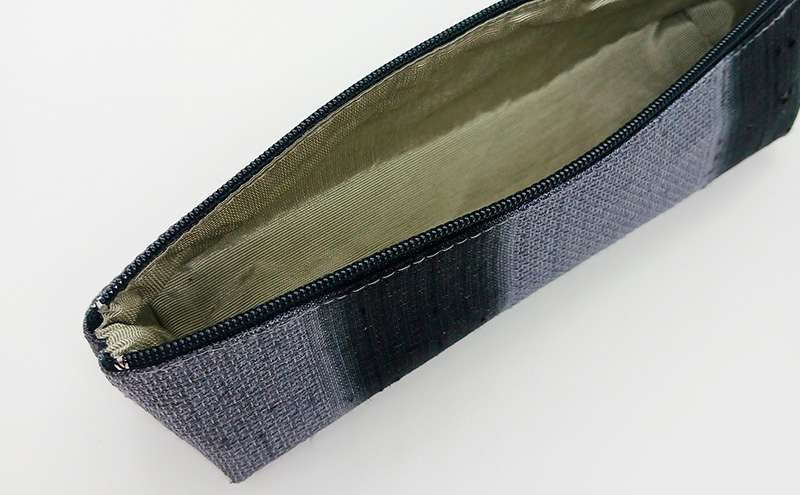 山菜の「ぜんまい」の綿毛を織り込んだ、きものの青柳のオリジナル生地をを使用したペンポーチです。約10本のペンを収納できます。持ち運びにちょうど良いサイズ感となっております。