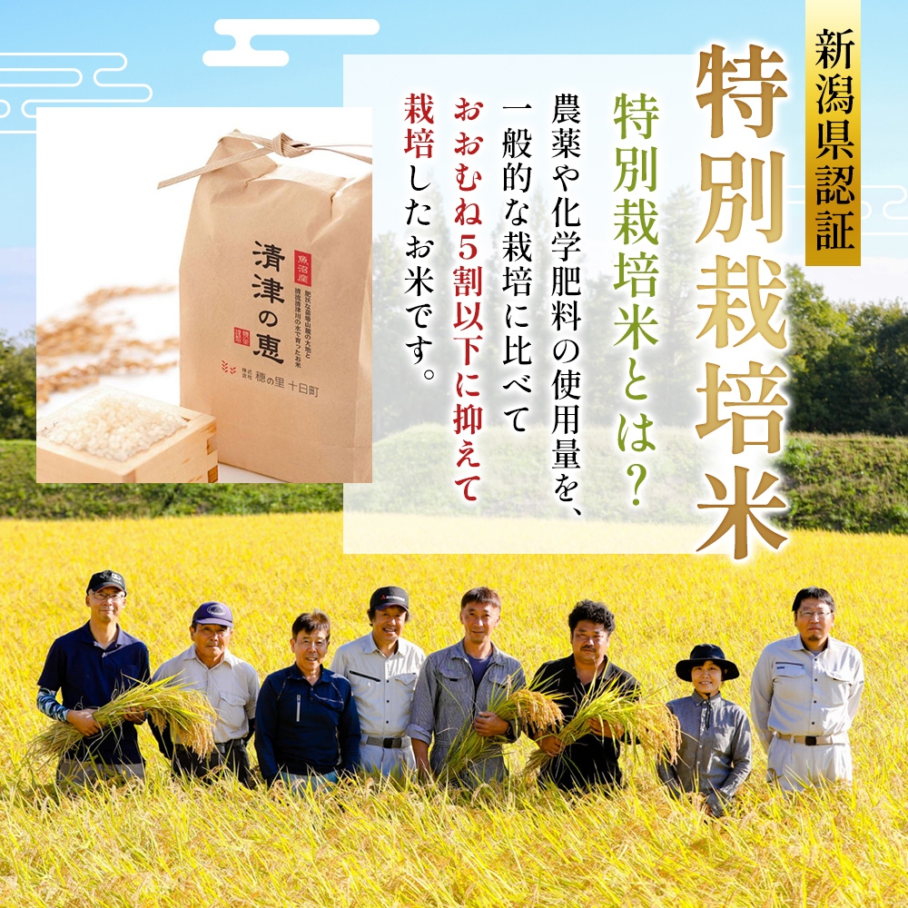 〈清津の恵〉は栽培期間中の農薬と化学肥料の使用を通常より5割以上減らして栽培された、新潟県認証を受けた特別栽培米です。