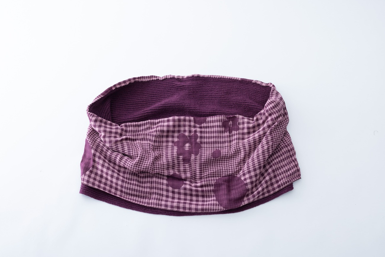 ガーゼのような柔らかな肌触りのジャガード織物とニットを組み合わせたデザイン性の高いスヌードです。ジャガード織物の面を表にして着用すると華やかな印象に、ニットの面を表にするとシックな印象に…と1枚でコーディネートに与える印象をガラッと変えてくれます。
