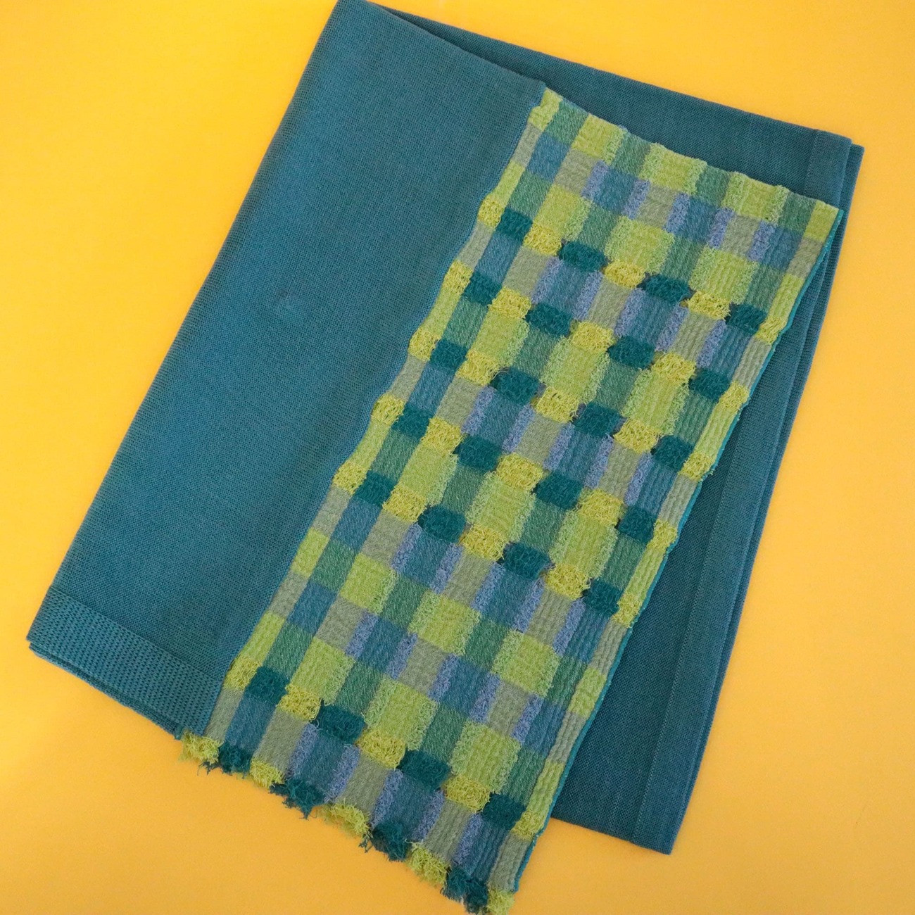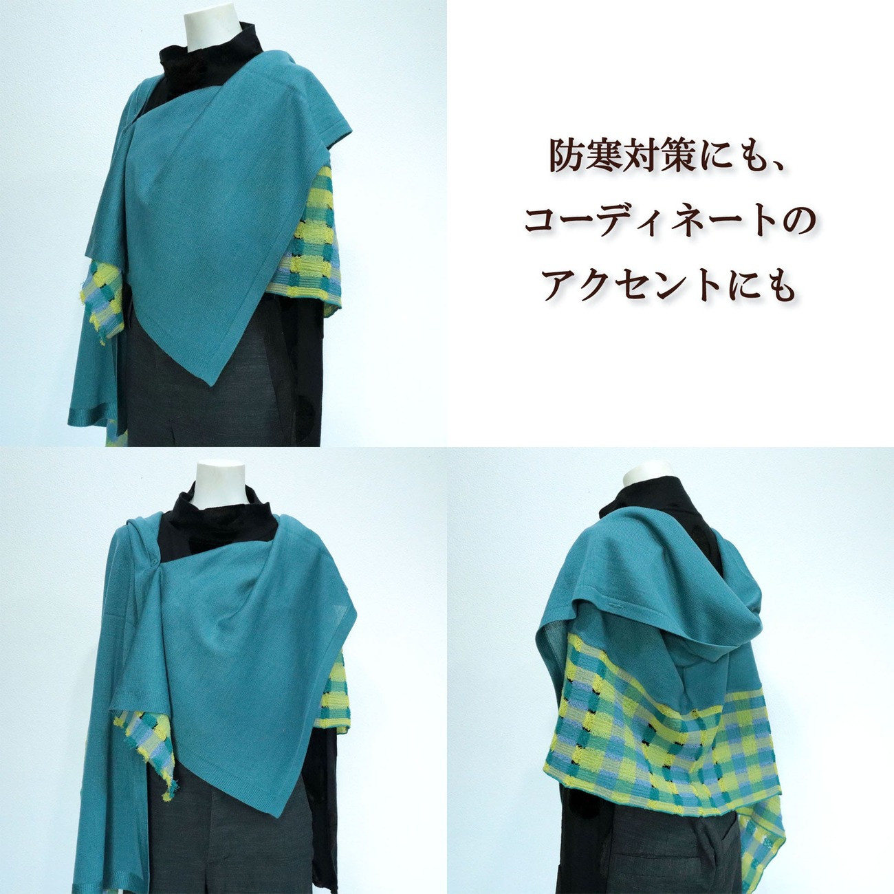 凹凸感のあるドビーチェックの織物とニットを組み合わせたデザイン性の高いストールです。そのまま首に掛けてストールとしてお使いいただけます。