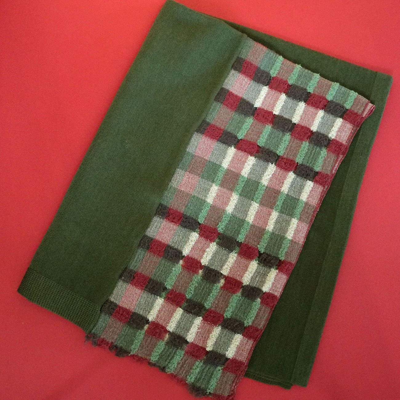 凹凸感のあるドビーチェックの織物とニットを組み合わせたデザイン性の高いストールです。そのまま首に掛けてストールとしてお使いいただけます。