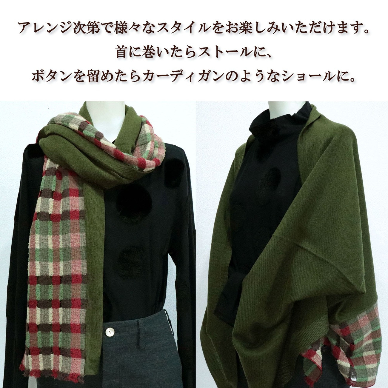 着用の仕方次第で様々な印象を与えることが出来る万能ストールです。