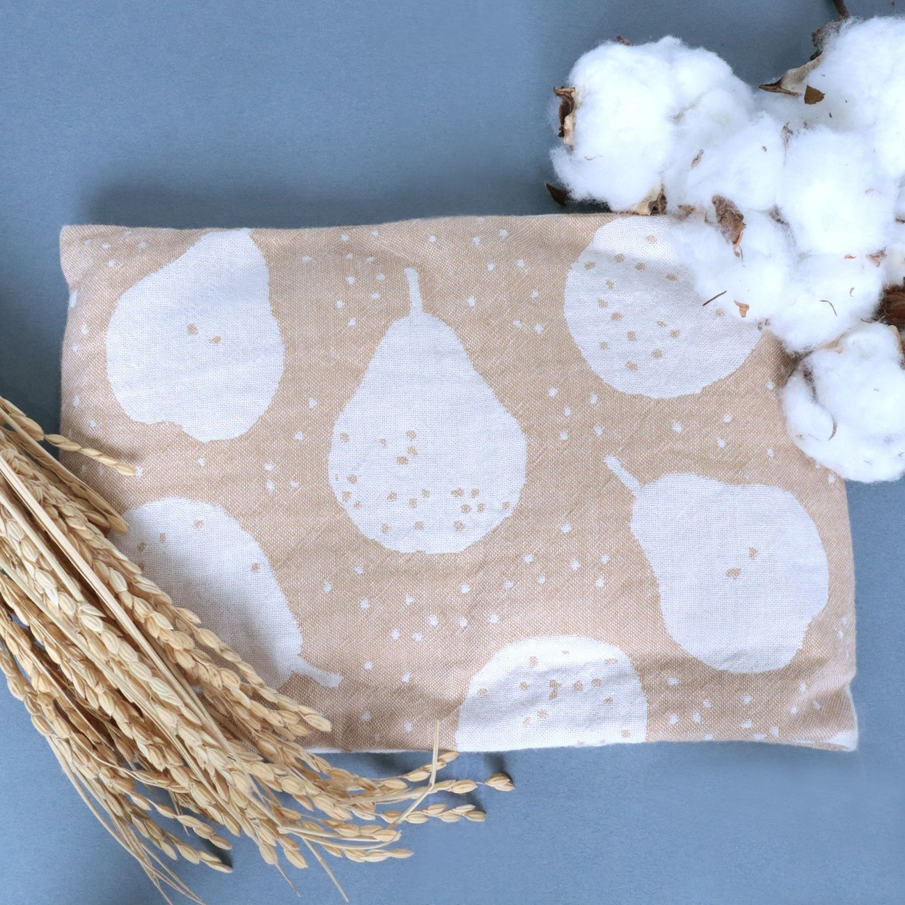 ルレクチェをイメージしたテキスタイルで作られたカバーはオーガニックコットン100%。