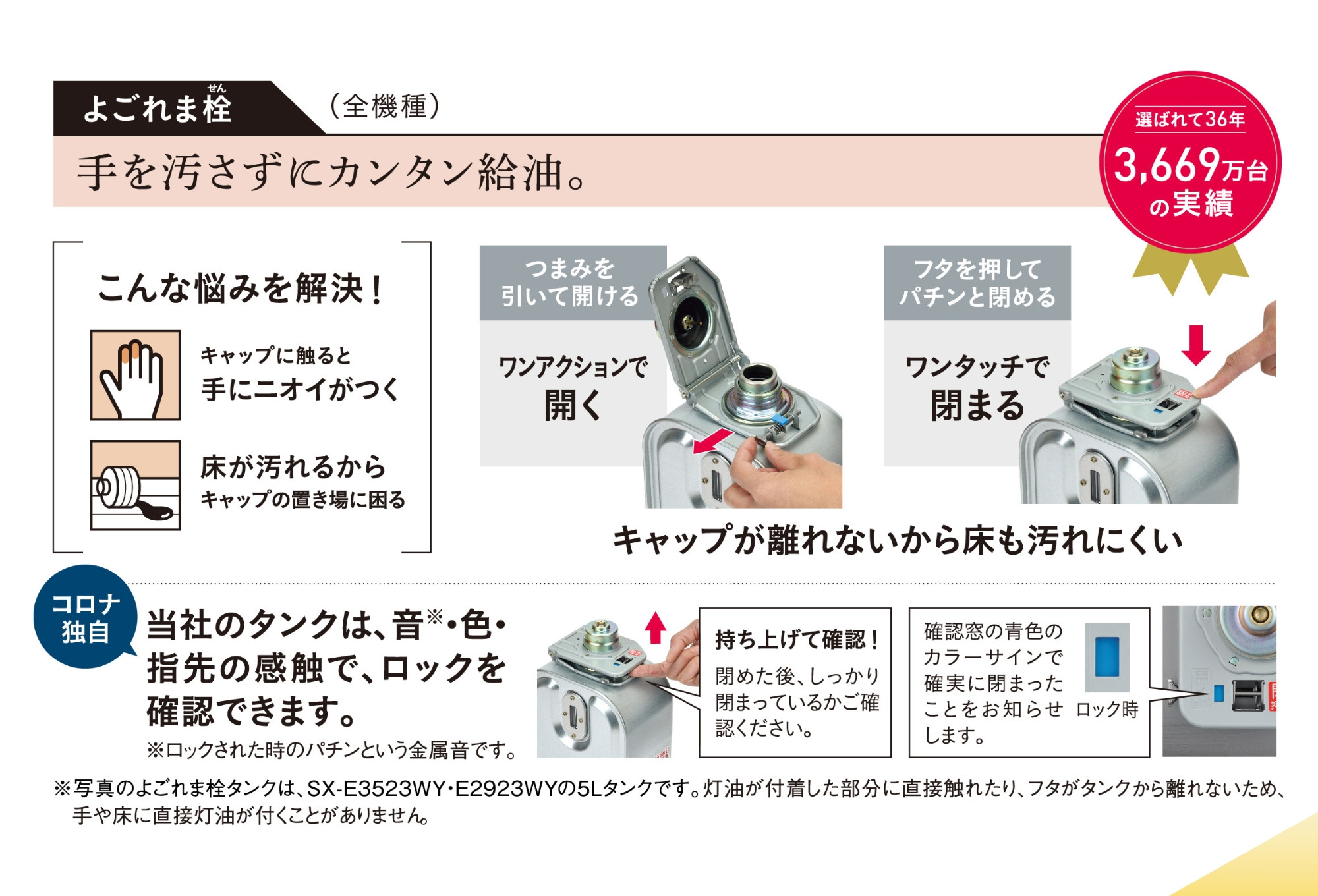 | 容量 | ポータブル石油ストーブ(反射型)SX-2425Y(S) 色 (S)シルバー 暖房の目安 木造(戸建)7畳まで(11.5平方メートル) コンクリート(集合)9畳まで(15.0平方メートル) 暖房出力 2.42~1.93kW タンク容量 4L 外寸寸法 高さ510×幅452×奥行324mm 質量 7.6kg その他 [乾電池別売]単一形/2個使用 |