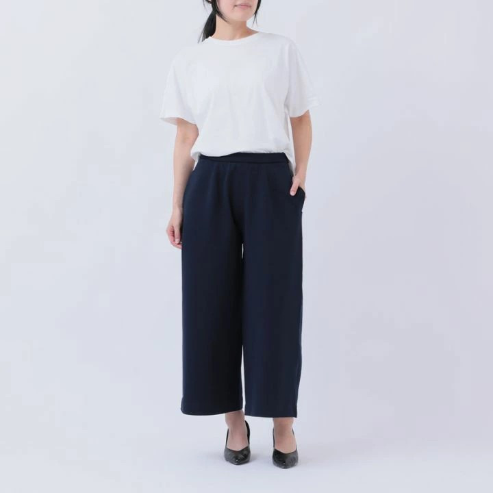 9分丈の長めでボリュームをとったワイドパンツなので腰回りや足のシルエットを気にせず履けます。