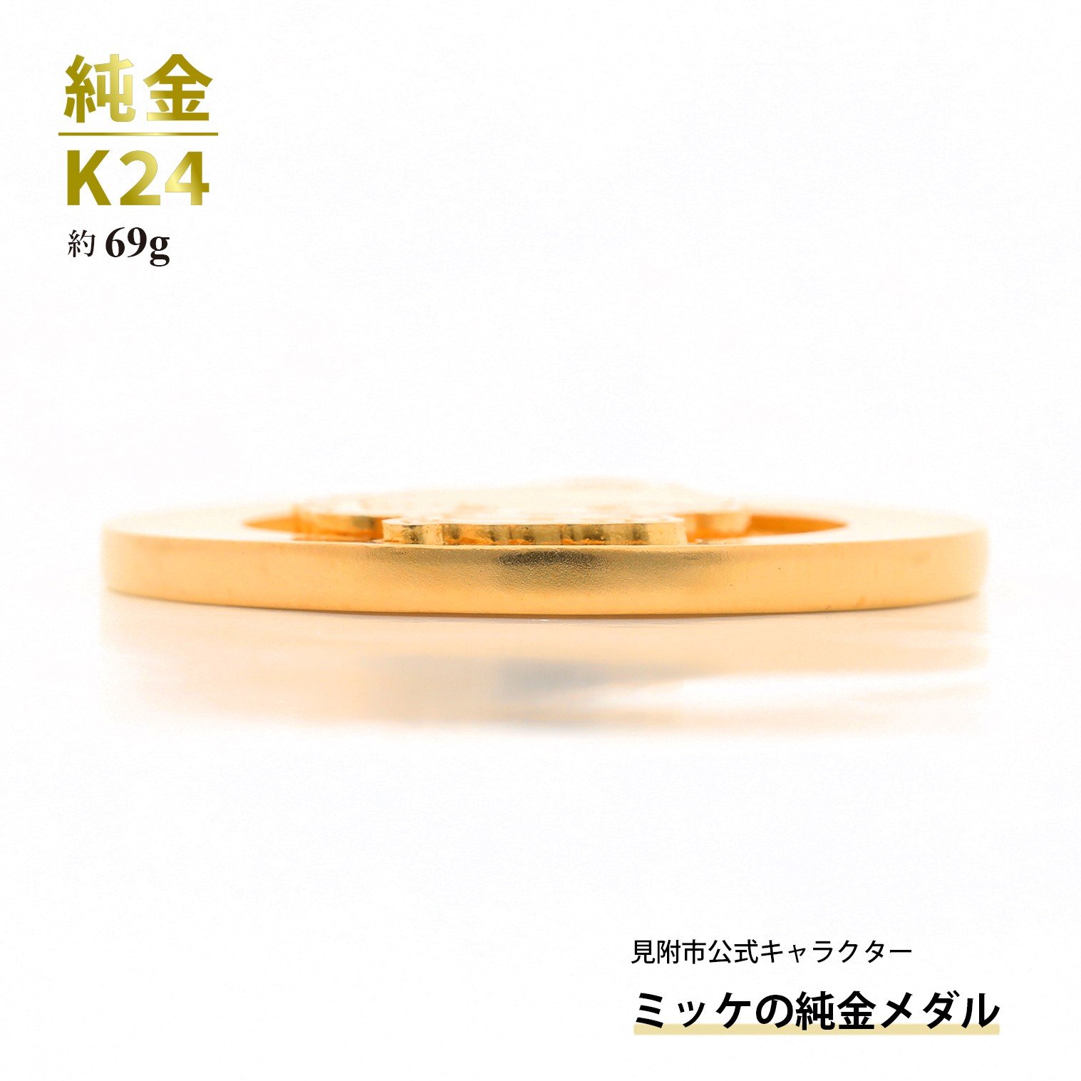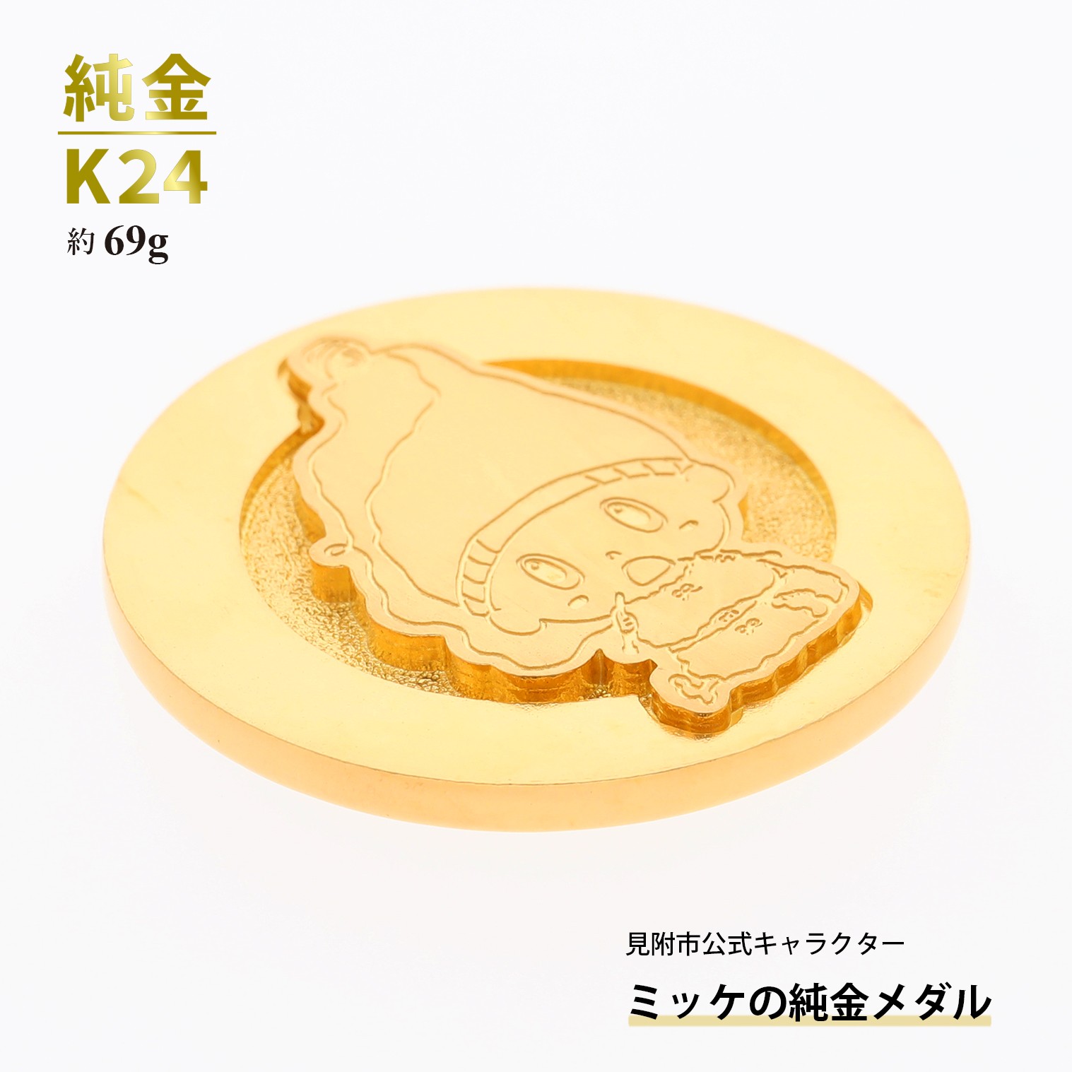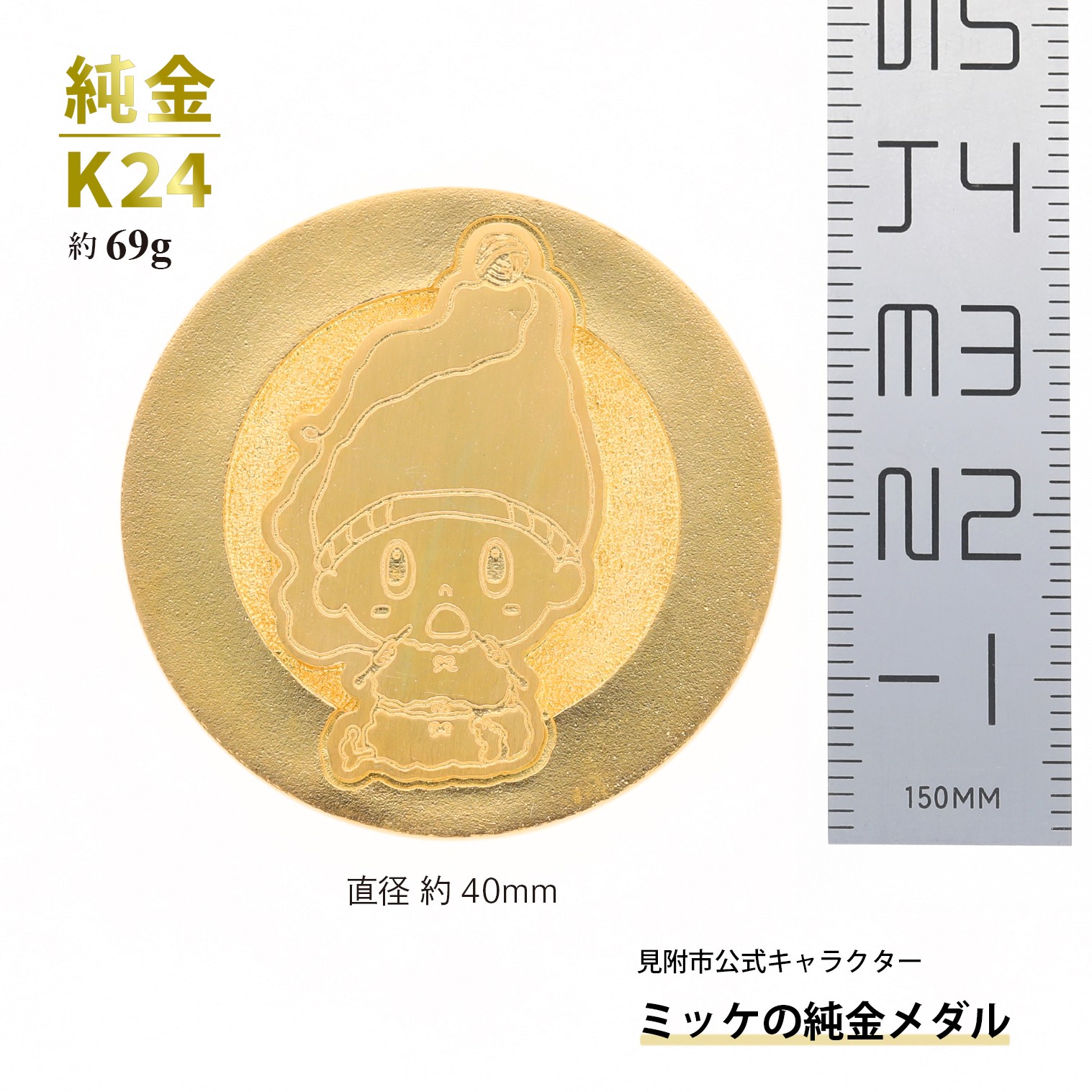 | 容量 | ミッケメダル 中(約69g)専用保管箱付き 純金メダル ・直径:約40mm ・厚み:最大約3.7mm、最小約3mm ・重量:約69g |